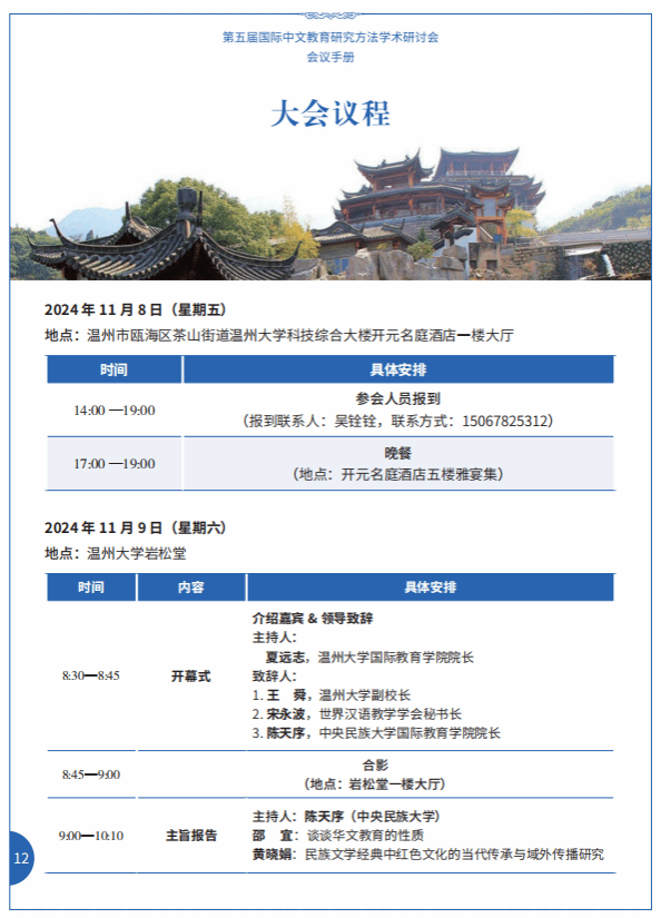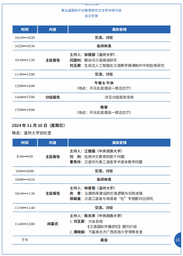 11月8日—10日,我学院与中央民族大学联合主办“第五届国际中文教育研究方法学术研讨会”,参会人员包括上海师大曹秀玲、暨南大学绍宜、中央民大刘玉屏等专家,具体会议安排如下图,欢迎各位老师参加!